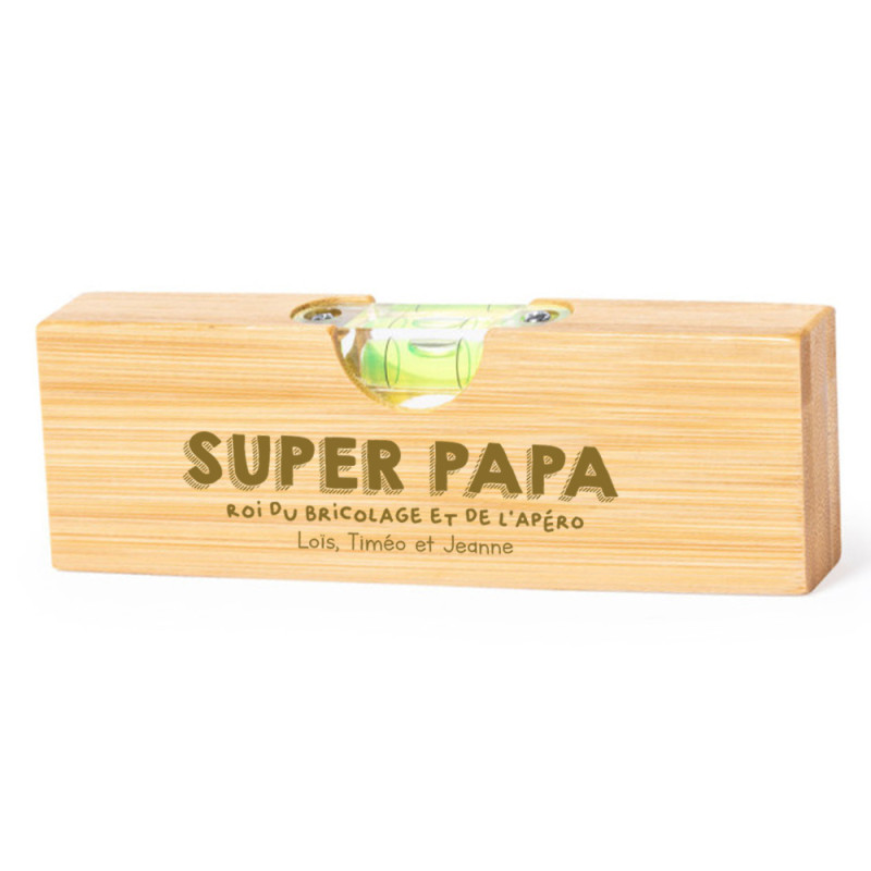 Le texte “SUPER PAPA, roi du bricolage et de l’apéro”, accompagné, en signature, du prénom de l’enfant.
