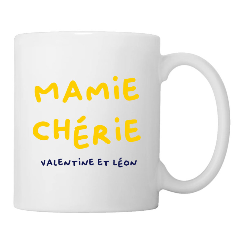 Le texte “Mamie Chérie” est imprimé en jaune, pour une touche lumineuse et joyeuse, tandis que les prénoms des petits-enfants apparaissent en bleu, créant un contraste doux et élégant.