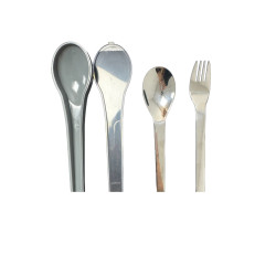 Set de couverts à emporter en inox. Il manque le couteau et petit défaut sur le côté de la cuillère, voir photo 2.