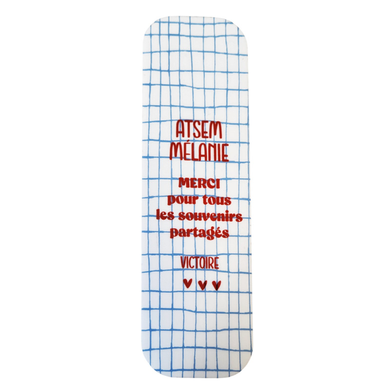 Offrez un marque-page personnalisé coloré, fabriqué en France, pour remercier celles et ceux qui ont accompagné votre enfant tout au long de l’année scolaire, comme une maîtresse, un maître, une nounou, une AESH ou une ATSEM. Pratique, tendance et coloré, ce marque-page permet de retrouver sa page en un clin d’œil tout en laissant un joli souvenir à la personne à qui vous l'offrez.