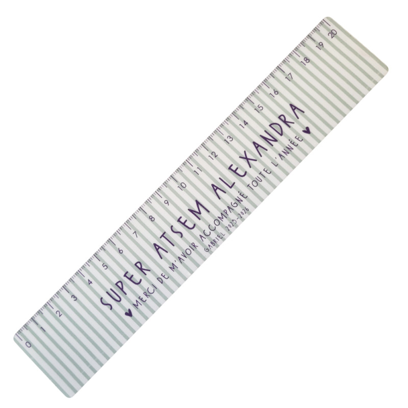 Offrez un cadeau original et utile pour remercier celles et ceux qui ont accompagné votre enfant tout au long de l’année scolaire avec notre règle personnalisée de 20 cm. Fabriquée et imprimée dans notre atelier normand, cette règle allie utilité et esthétisme, avec des couleurs joyeuses qui en font un objet unique et décoratif au quotidien.