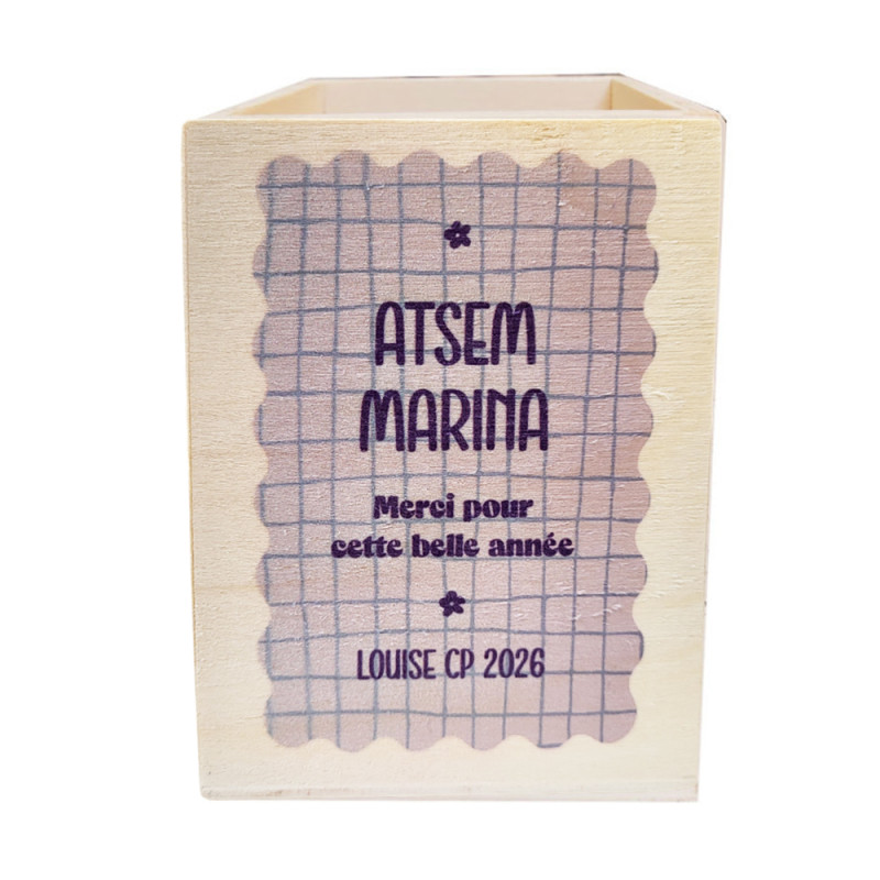 Grâce à son impression personnalisée, ce pot à crayon en bois sera idéal à offrir pour remercier une maîtresse, un maître, une nounou, une AESH ou une ATSEM. Il peut être entièrement personnalisé avec la dénomination et/ou le nom de la personne et le prénom de votre enfant ou sa classe au bas, ce qui rendra votre cadeau totalement unique et original.