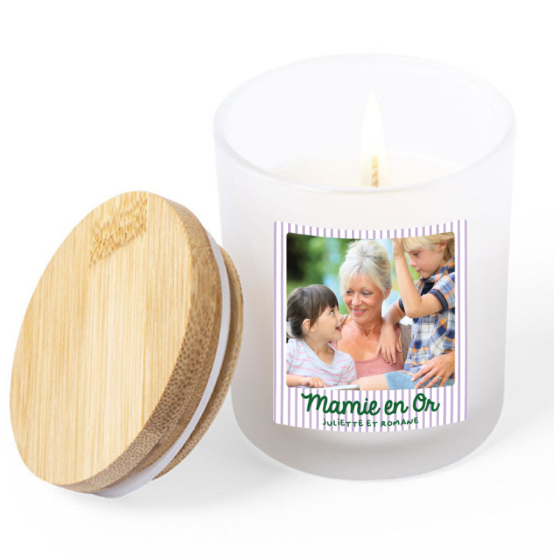 Fondez pour cette bougie personnalisée à la douce odeur de vanille, idéale pour célébrer la fête des Grands-Mères avec amour. Son visuel pop et coloré “Mamie en Or”, sublimé par le prénoms des petits-enfants et une photo souvenirs apporte une touche moderne, joyeuse et pleine de tendresse à votre cadeau.