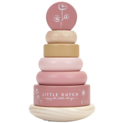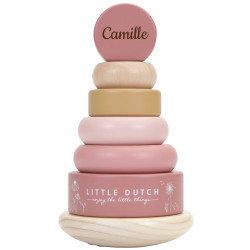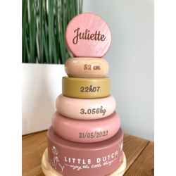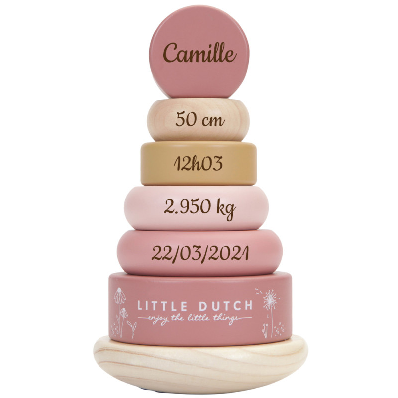 Découvrez la Tour d'anneaux à empiler en bois rose de la marque Little Dutch personnalisée avec les informations de naissance de l’enfant. Un cadeau unique et original qui surprendra les heureux parents du nouveau-né.