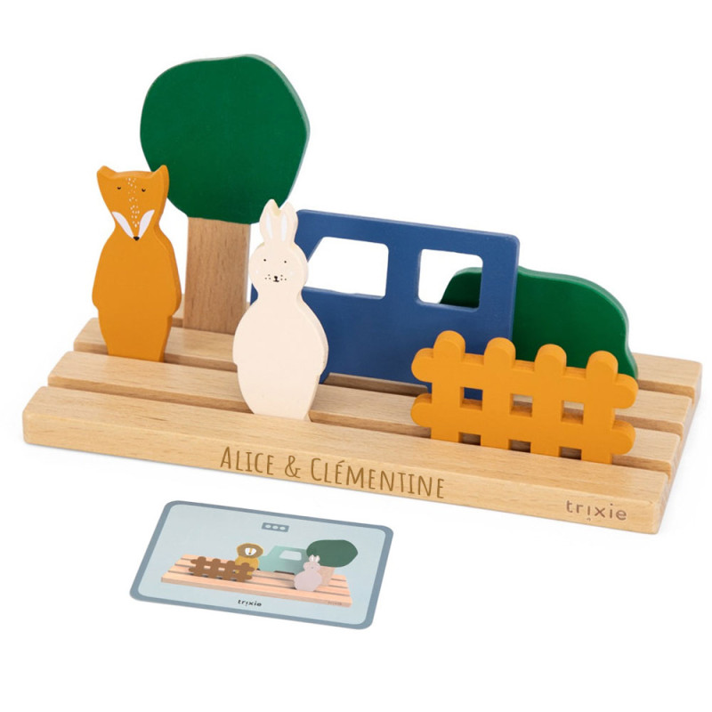 Ce jeu se compose au total de 10 : un plateau, un arbre, 3 animaux, un buisson, 2 véhicules, une barrière et une maison. En plus de ces pièces de jeu, ce jouet dispose 5 cartes de jeu double face qui permet de réaliser 10 mise en place différentes.