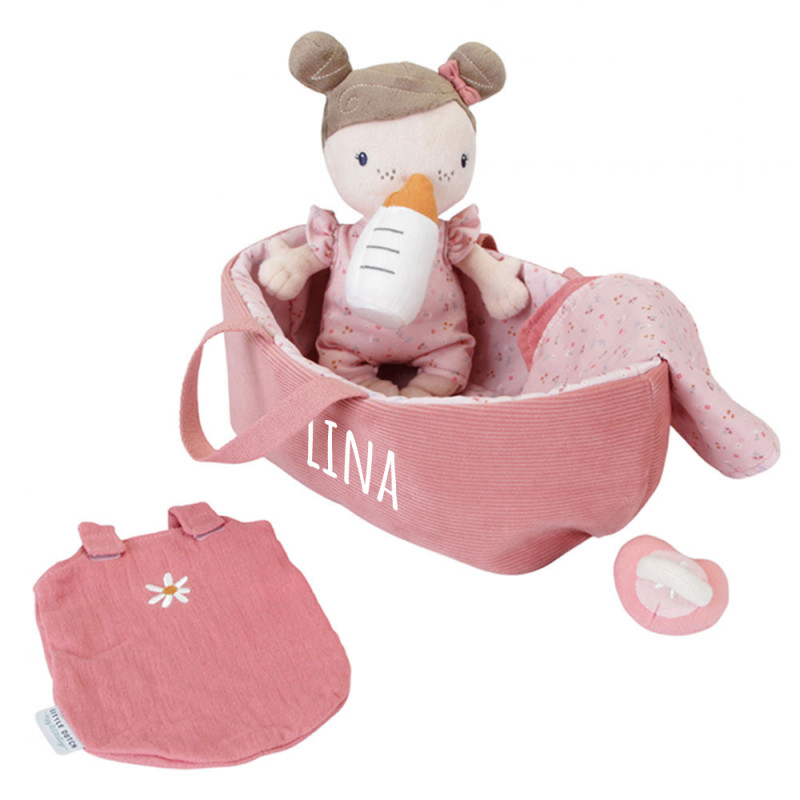 Ce joli poupon et ses accessoires en tissus seront parfaits pour jouer au papa et à la maman. Vous avez la possibilité de faire broder un coté du couffin pour rendre votre cadeau totalement unique.