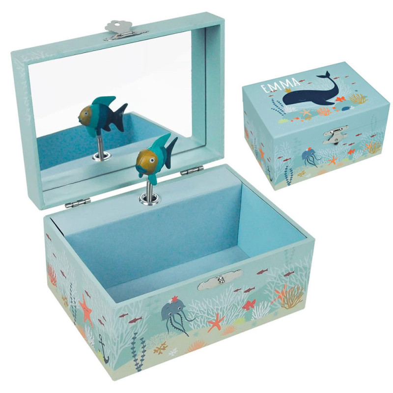 Plongez dans l'univers de l'Océan avec la boîte à musique de la marque Trousselier. La personnalisation avec le prénom de votre choix ajoute une touche spéciale à ce cadeau mémorable, créant un objet qui sera chéri pendant des années. Imaginez le sourire de votre petit trésor lorsque le petit poisson prendra vie en jouant une mélodie enchanteresse.