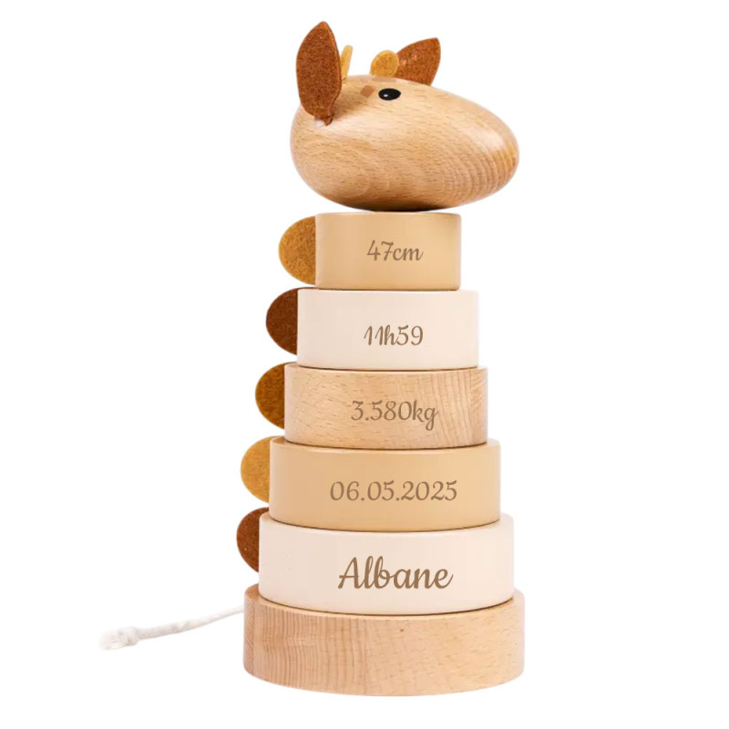 Découvrez la Pyramide en bois Léonie la Girafe de la marque Egmont Toys personnalisée avec les informations de naissance de l’enfant. Un cadeau unique et original qui surprendra les heureux parents du nouveau-né.
