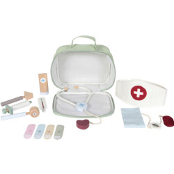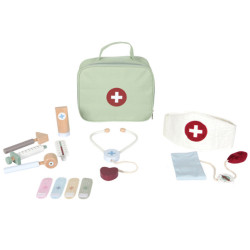 Cette ravissante mallette de docteur pour enfant en tissu comprend différents accessoires :