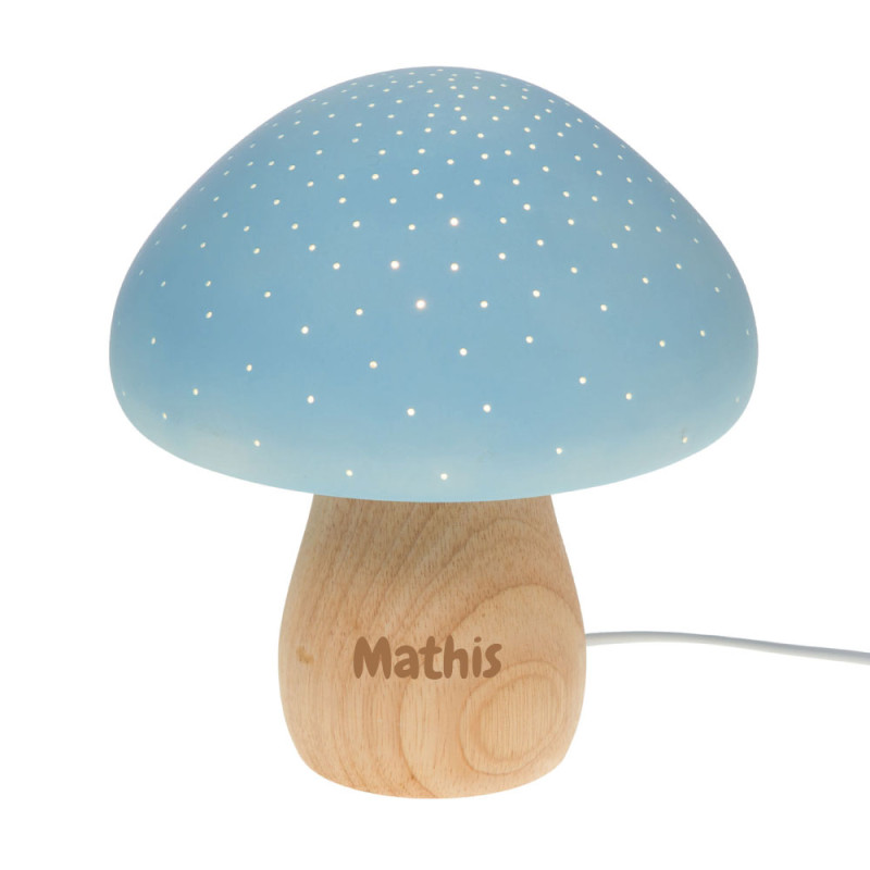 Petit plus plein de tendresse : vous pouvez personnaliser la lampe champignon en faisant graver le prénom de votre enfant sur son socle en bois.