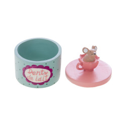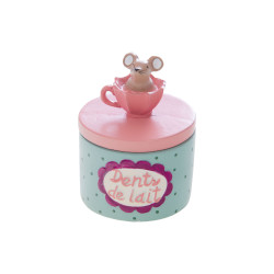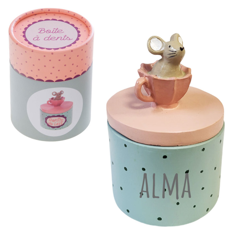 Sur la première face de la boîte à dents en résine vous retrouvez l'inscription : Dents de lait. Et, sur l'autres face vous pourrez y faire graver le prénom de votre enfant. La gravure de cette boîte à dents de lait est réalisée dans notre atelier situé en Normandie, près de Caen, par notre équipe. Quand au couvercle, il est orné d'une adorable figurine représentant une jolie petite souris !