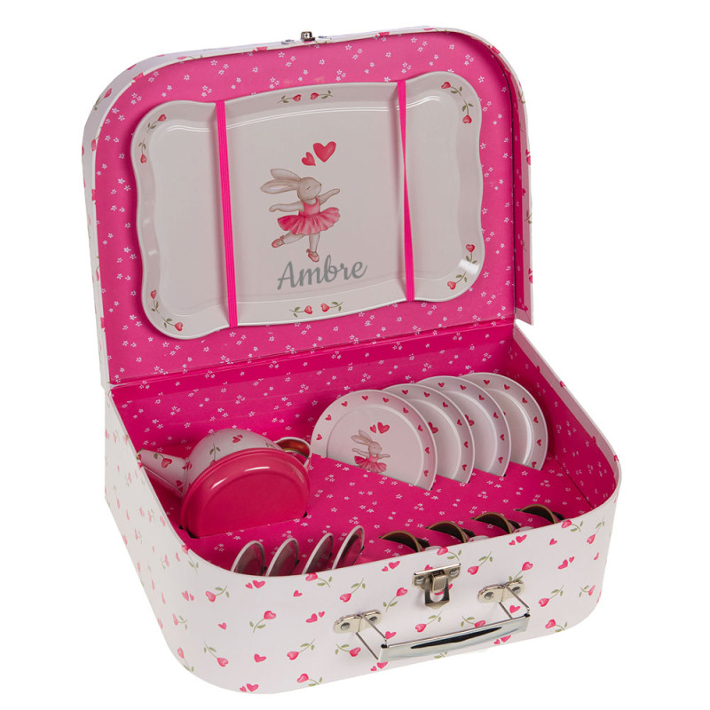 Découvrez l'adorable service à thé et sa valisette personnalisée sur le thème d'une petite lapine ballerine de la marque Amadeus. Votre enfant pourra s'amuser à vous imiter en préparant, lui aussi son café ou son thé, avec la superbe valisette Ballerine. Vous avez la possibilité d'ajouter au plateau illustré d'une petite ballerine, une personnalisation avec le texte de votre choix : un prénom, un texte, une date,...