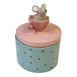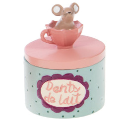 Sur la première face de la boîte à dents en résine, vous retrouvez l'inscription : "Dents de lait". Et, sur l'autre face, vous pourrez y faire graver le prénom de votre enfant. La gravure de cette boîte à dents de lait est réalisée dans notre atelier situé en Normandie, près de Caen, par notre équipe. Quant au couvercle, il est orné d'une adorable figurine représentant une jolie petite souris !