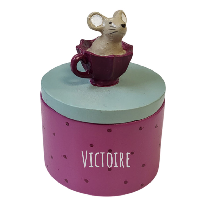 Sur la première face de la boîte à dents en résine, vous retrouvez l'inscription : "Dents de lait". Et, sur l'autre face, vous pourrez y faire graver le prénom de votre enfant. La gravure de cette boîte à dents de lait est réalisée dans notre atelier situé en Normandie, près de Caen, par notre équipe. Quant au couvercle, il est orné d'une adorable figurine représentant une jolie petite souris !