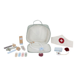 Cette ravissante mallette de docteur pour enfant en tissu comprend différents accessoires :