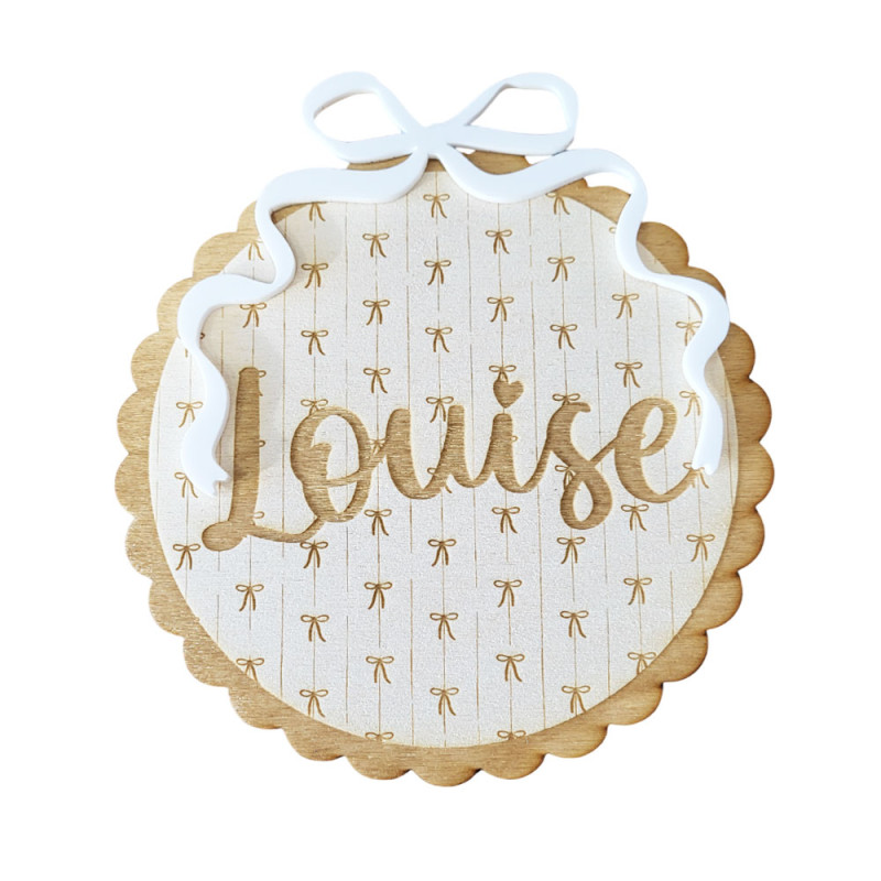 Annoncez le prénom de votre bébé de la plus jolie des manières grâce à cette carte étape prénom Coquette, délicatement ornée de petits nœuds gravés et du prénom de l’enfant au centre. Une création pleine de douceur, idéale pour une annonce de naissance, une séance photo ou un souvenir précieux à conserver.