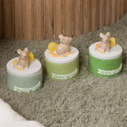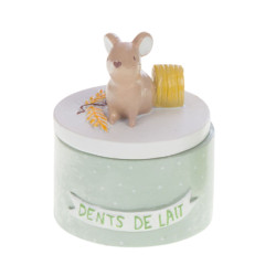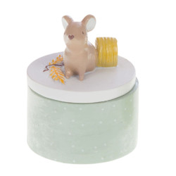 Le couvercle est orné d’une adorable figurine représentant une jolie petite souris, délicatement posée sur le dessus.