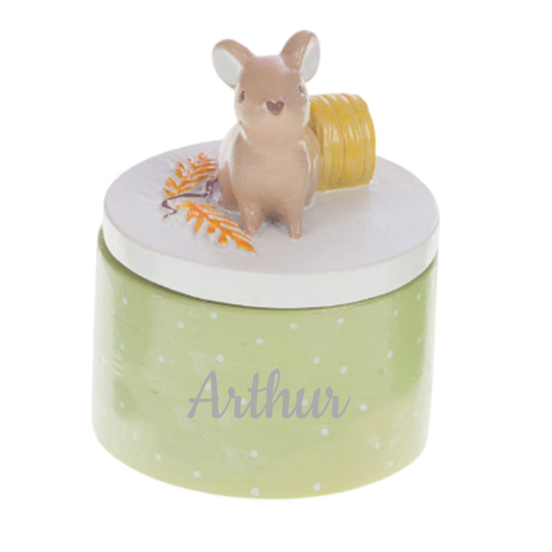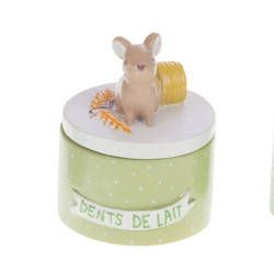 Le couvercle est orné d’une adorable figurine représentant une jolie petite souris, délicatement posée sur le dessus.