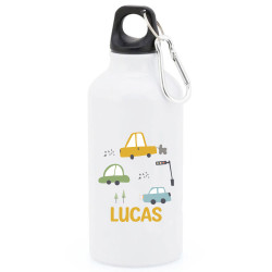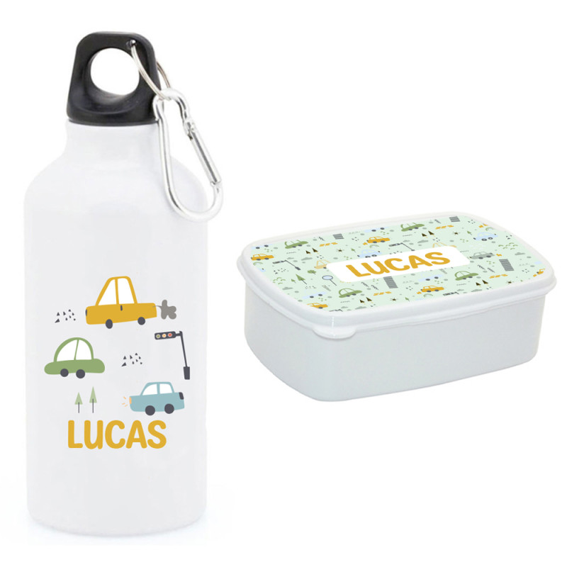 Pack gourde & boîte à goûter blanche - Petites voitures