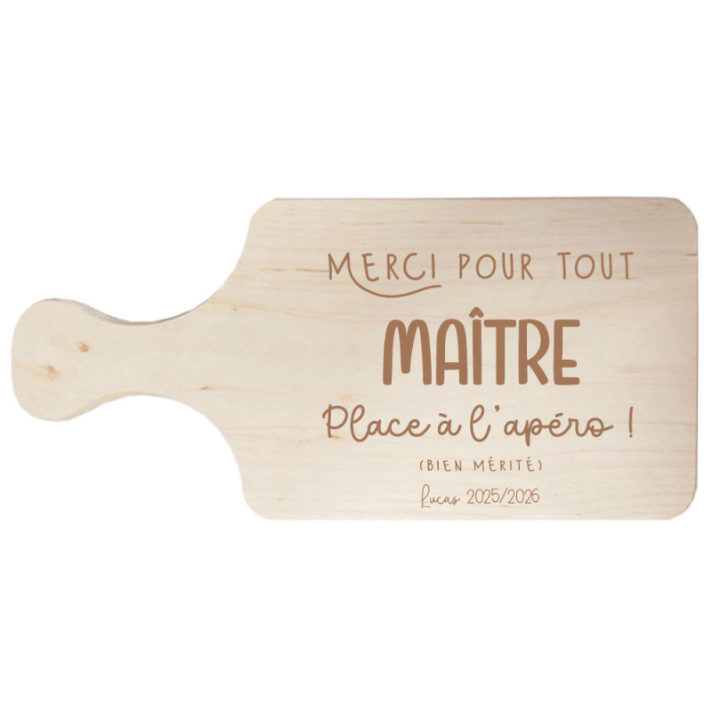 Célébrez la fin de l’année scolaire avec une planche apéro personnalisée, un cadeau à la fois utile, esthétique et chargé d’émotion. Idéale pour remercier un maître, une maîtresse, une ATSEM ou une nounou, cette planche en bois gravée devient un souvenir unique qui marquera cette année passée aux côtés de votre enfant.