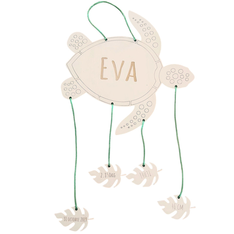 Sur la tortue vous pourrez faire graver le prénom de votre bébé. Les autres informations telles que son poids, sa taille, l’heure de et la date de sa naissance seront gravées sur les petites feuilles qui sont accrochés, grâce à une jolie cordelette, à la tortue.