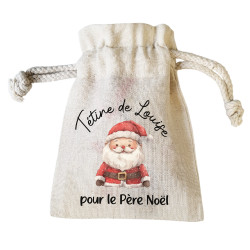 Le pochon personnalisé en tissu naturel, imprimé au prénom de votre enfant (ex. : Tétine de Louise). Orné d’une illustration du Père Noël, il crée un lien direct avec la magie de Noël. C’est dans ce pochon que l’enfant déposera sa précieuse tétine.