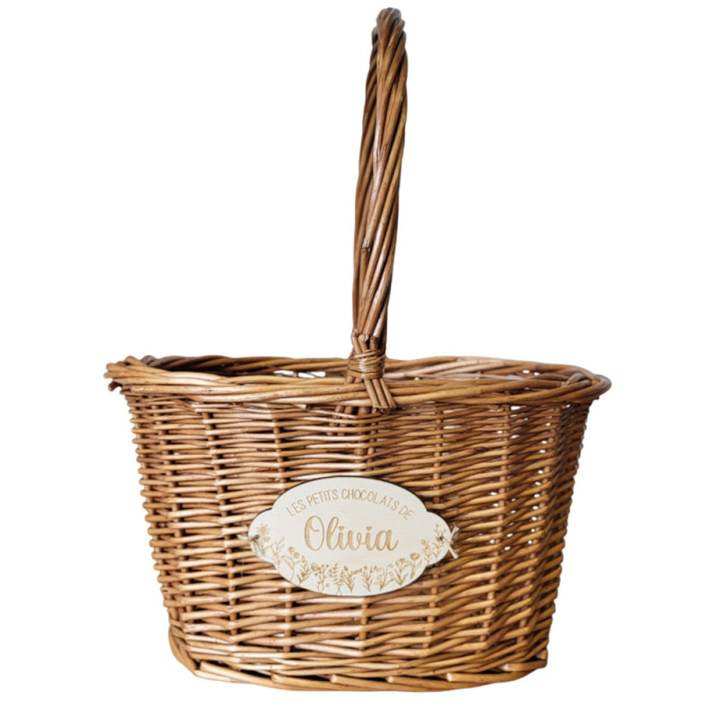 Le panier en osier personnalisé est un joli cadeau qui sera parfait à offrir lors d'une fête de Pâques aux enfants. Faites-y graver le prénom de votre choix sur la jolie étiquette découpée dans le bois. L'étiquette en bois représente sur le bas de jolies fleurs, sur le haut l'inscription "Les petits chocolats de ...".