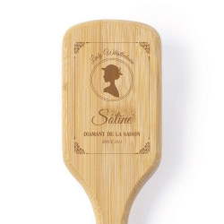 Cette brosse est fabriquée en bambou, une matière naturelle et écologique. La personnalisation est réalisée par gravure laser, avec un texte et un visuel inspirés de l’univers Bridgerton.